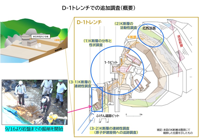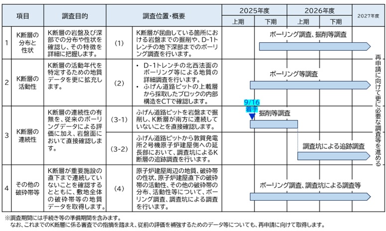 2025年9月16日、現地における追加調査に着手いたしました。まずK断層の連続性調査に係る「ふげん道路ピット」の岩盤までの掘削作業から開始し、今後も準備が整った作業から、安全確保を最優先に順次進めてまいります。